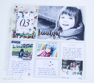1. Yo he elegido un tamaño en vertical, pero lo puedes realizar con cualquier otro tamaño. Pones la tarjetita de la semana o bien una foto mas pequeña y la colocamos en el centro, piensa que tanto por un lado como por otro ha de ir igual, por lo tanto elige lo que va a ir en la parte trasera porque el bolsillo ha de ir cerrado para que no se caiga el confetti.